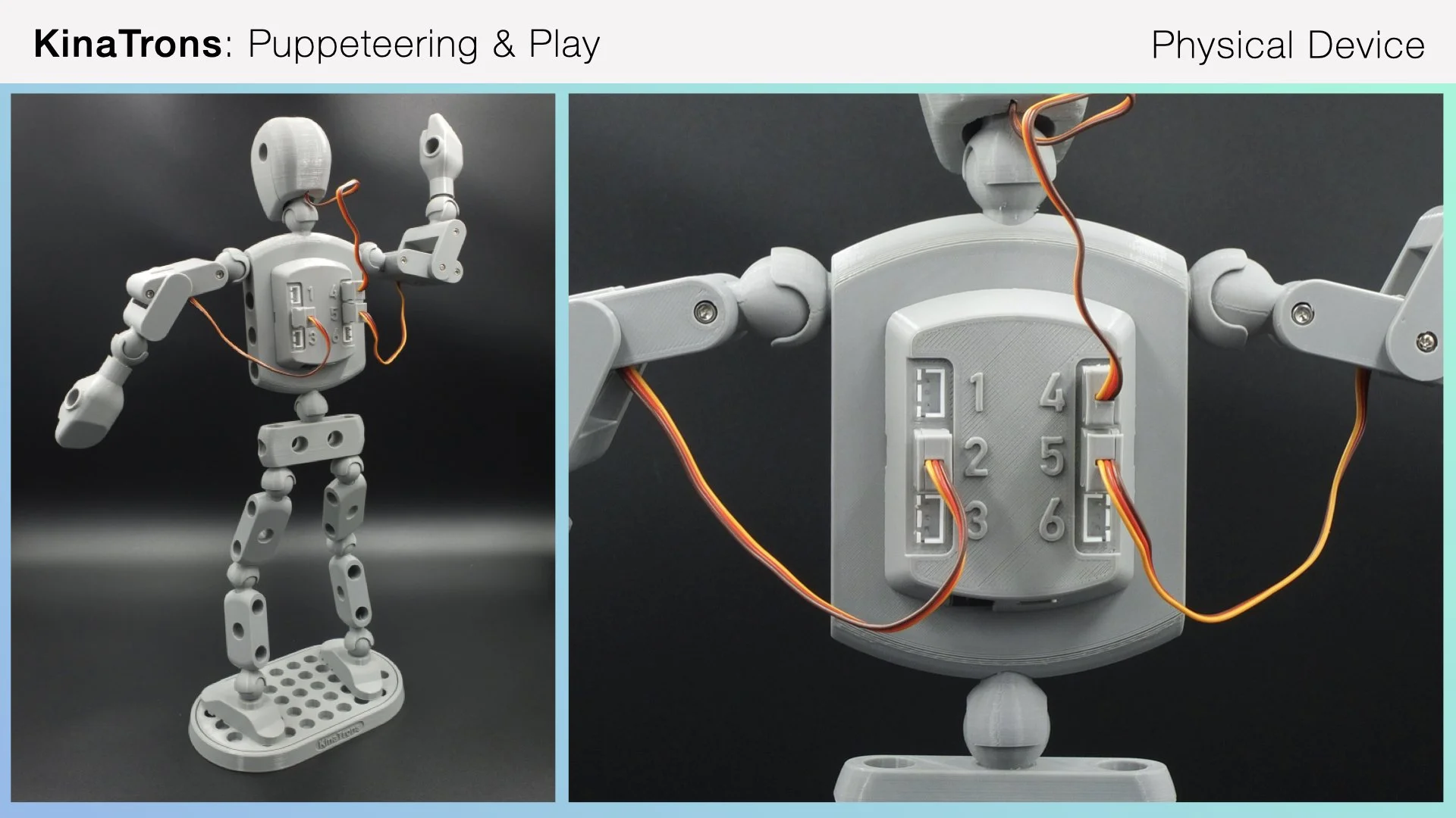 There are three major components to this project. The first being a web based user interface, built in P5.JS. The Kinatrons app uses the PoseNet library to estimate various body points from your video camera feed. Then the app calculates body angles from those points, and send that data in a string to the toy via serial connection. The data is received by the toy via The Torso module, which contains an Arduino and custom PCB that allows me to connect 6 servo-driven joints at once. The electronics within the Torso drive these servos, and makes sure that the joint angles are quickly translated from video feed to actual toy movement. The final component of Kinatrons is of course those servo driven joints, which can be assembled in various configurations to animate the toy in different ways.