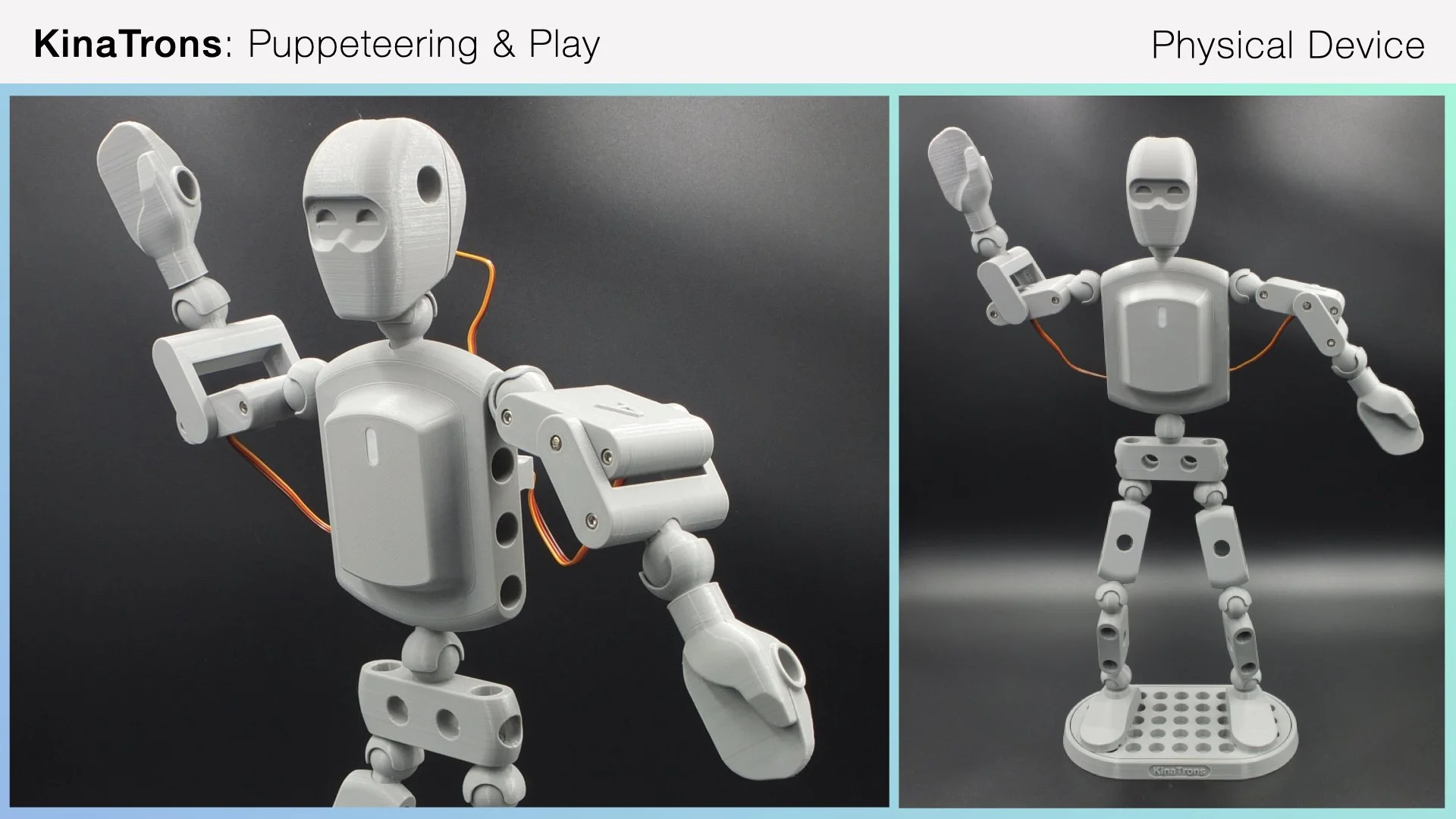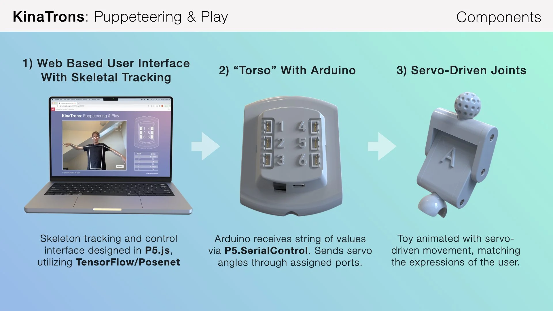 An experiment in puppeteering and play, KinaTrons is a reconfigurable, kinetic toy that responds to your body movements. The P5.js-based web app uses PoseNet to track your skeleton, and then communicates various body angles to Arduino via P5.serialcontrol.